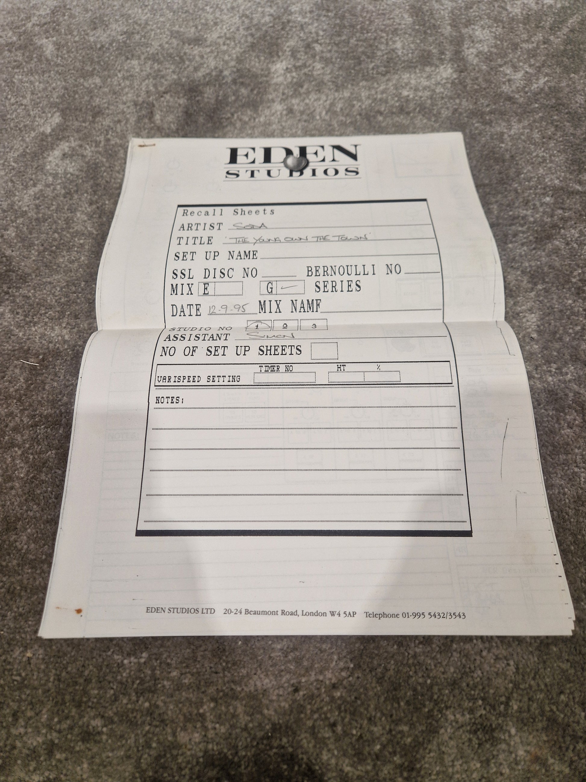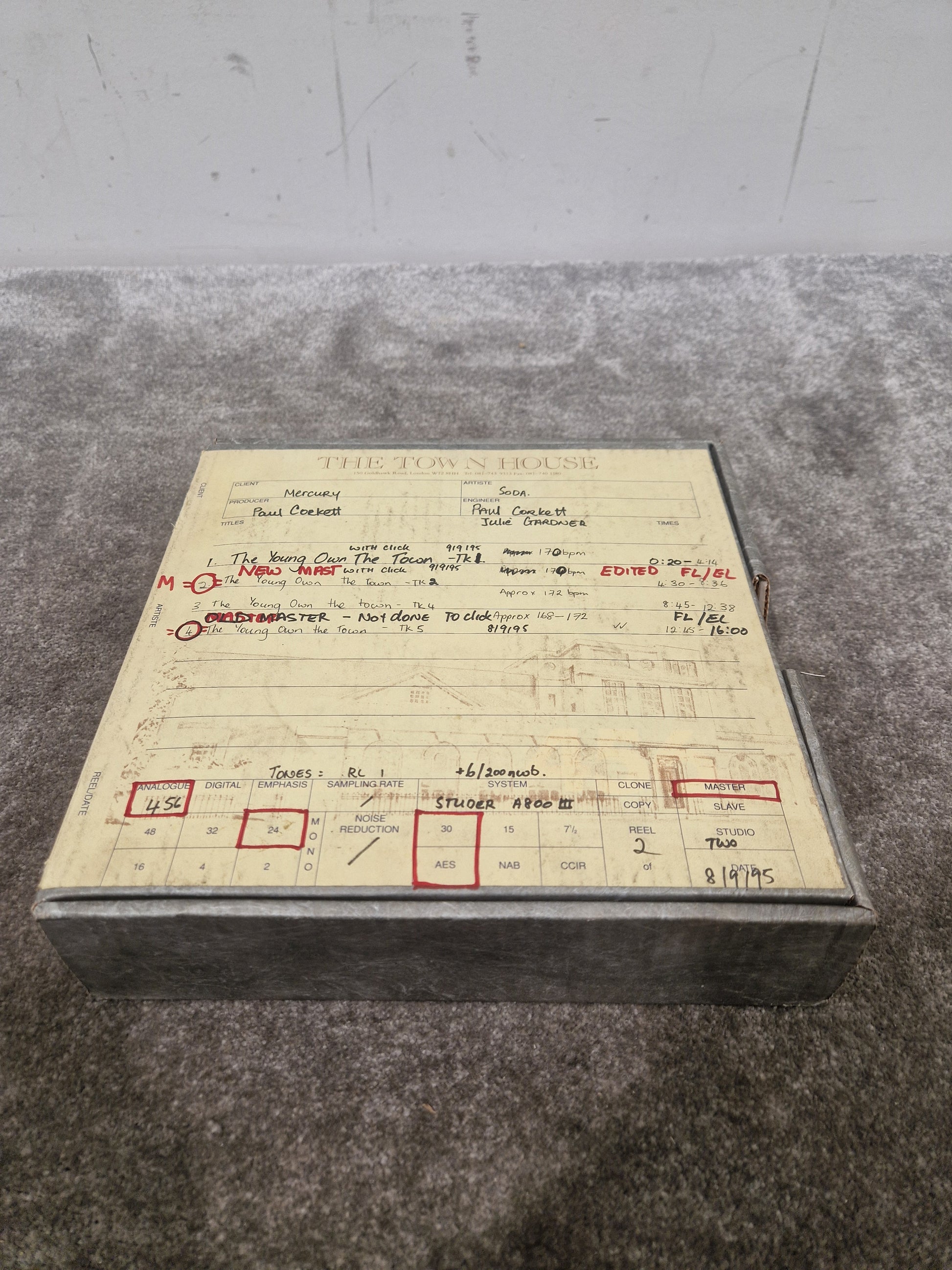 Condition Details: Please check all photos of the item carefully, as they form part of the description of the condition of the item. This professionally labeled reel-to-reel tape from The Town House (a division of Virgin Records Ltd.) is in excellent condition, with intact reels and detailed handwritten notes. Dated 8th–9th September 1995, the reel documents multiple takes of The Young Own The Town, including master edits, tempo variations, and click-track references. It has been professionally stored and remains fully playable for archival or reference use.
