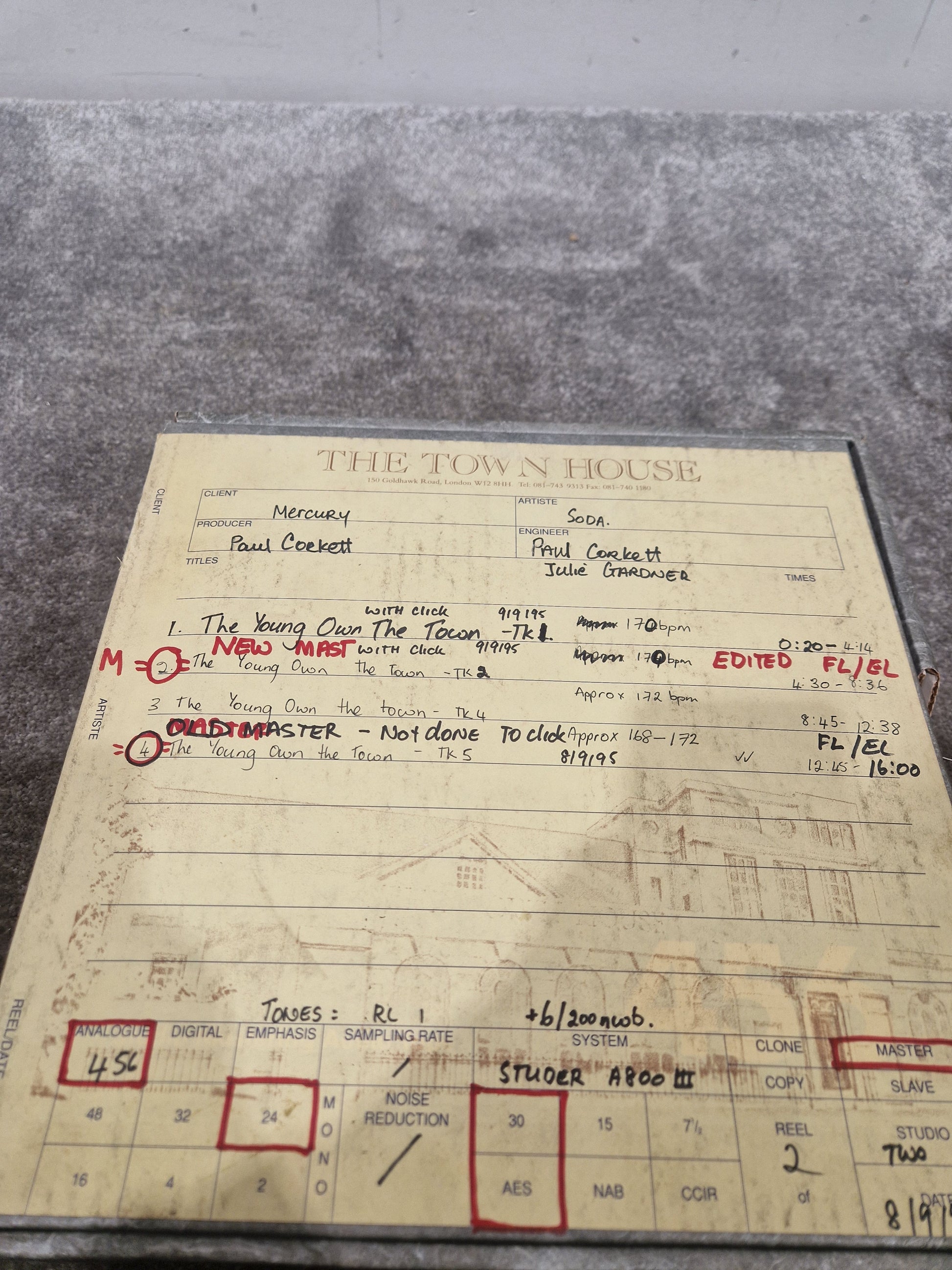 Soda – Britpop Band Collectible Town House Master Reel – Excellent w/ Multi-Take Breakdown of “The Young Own The Town”