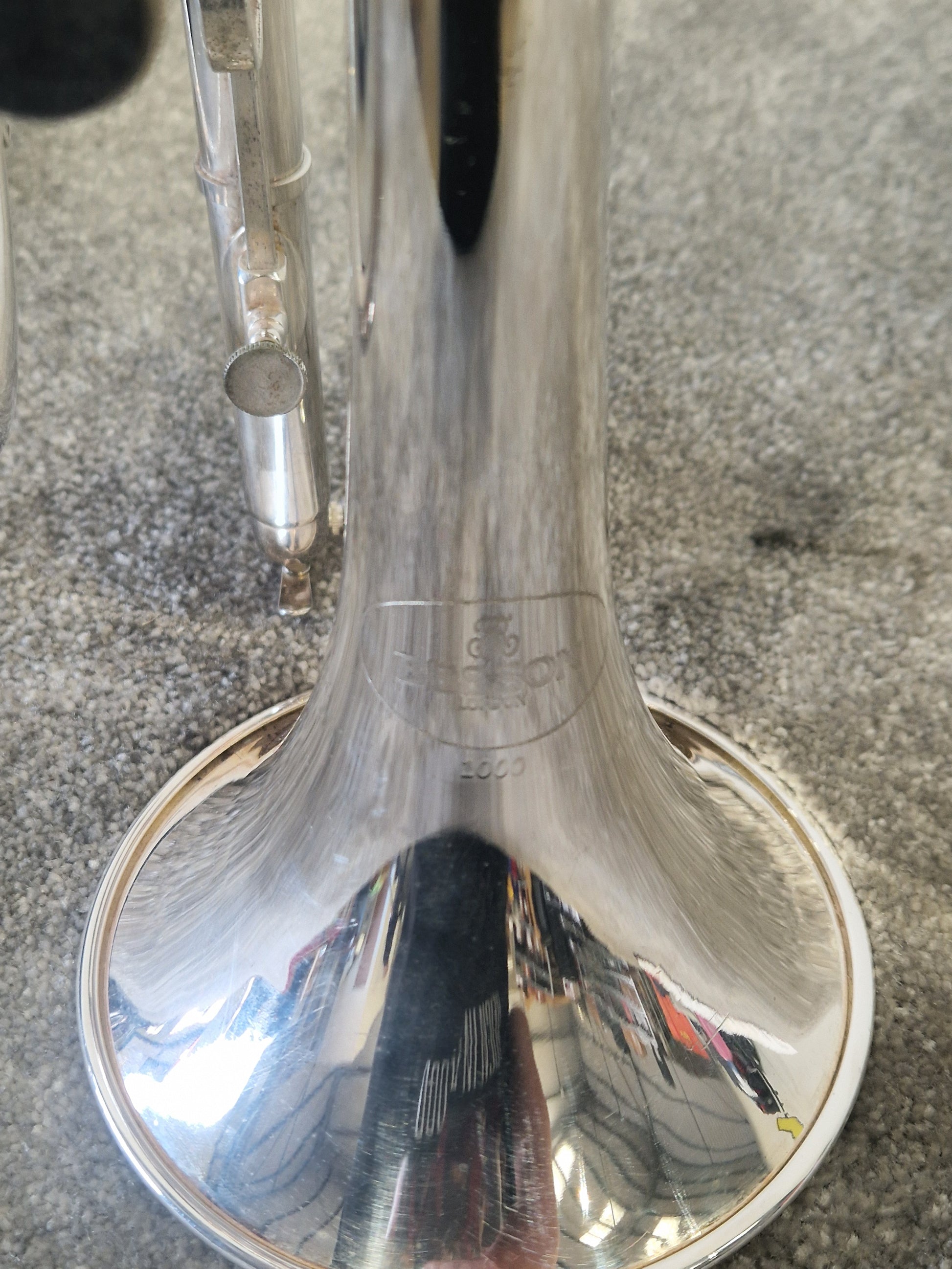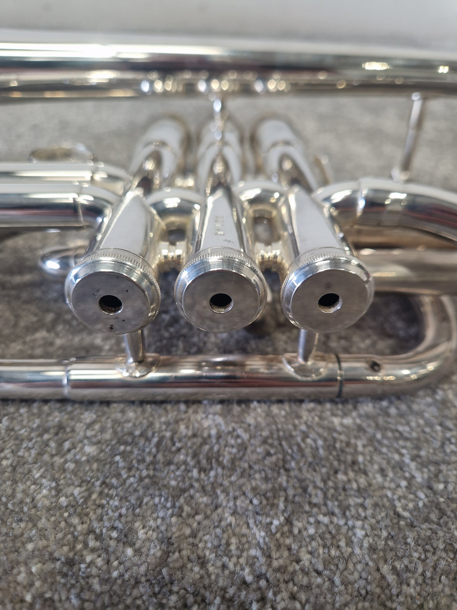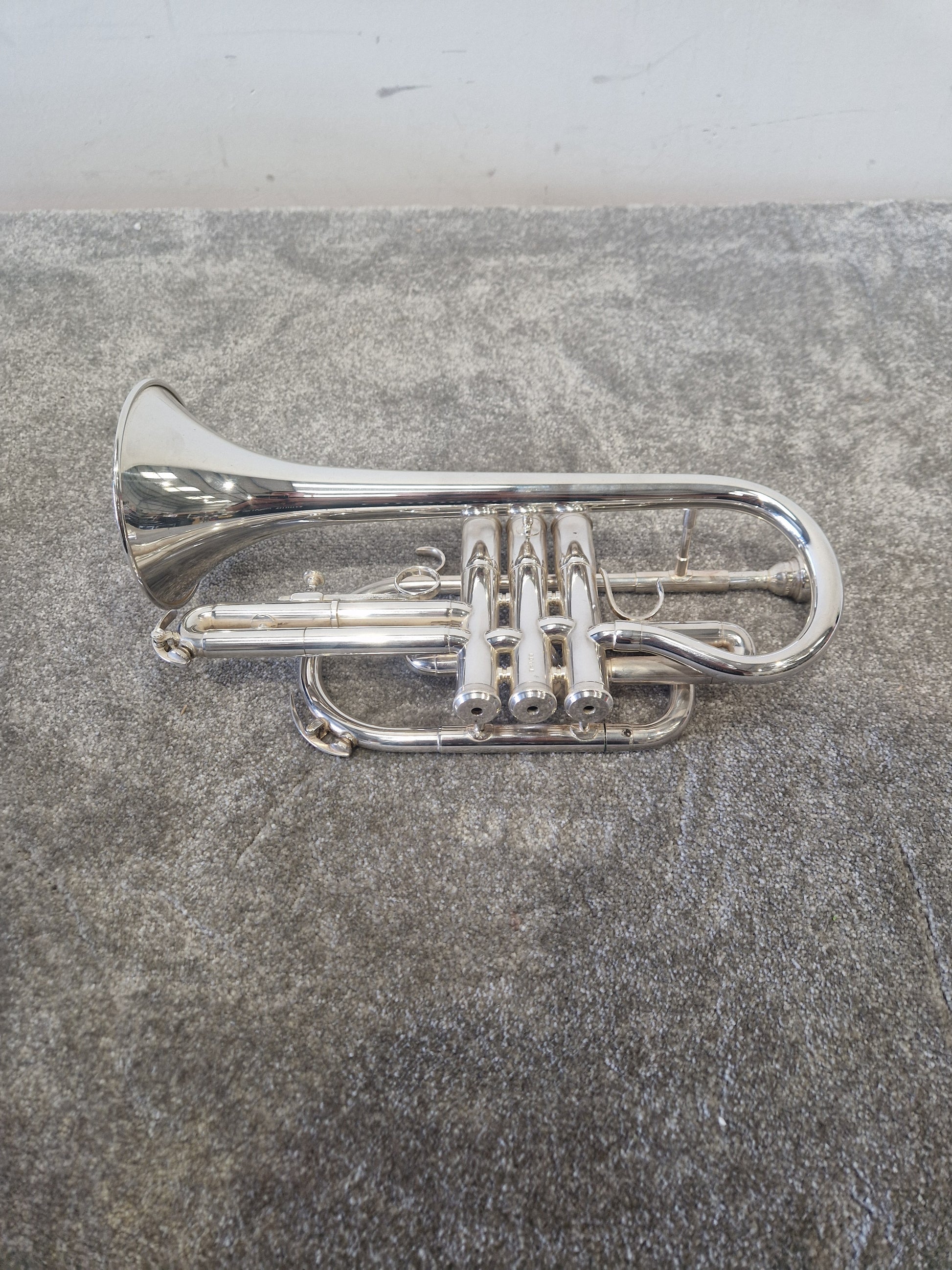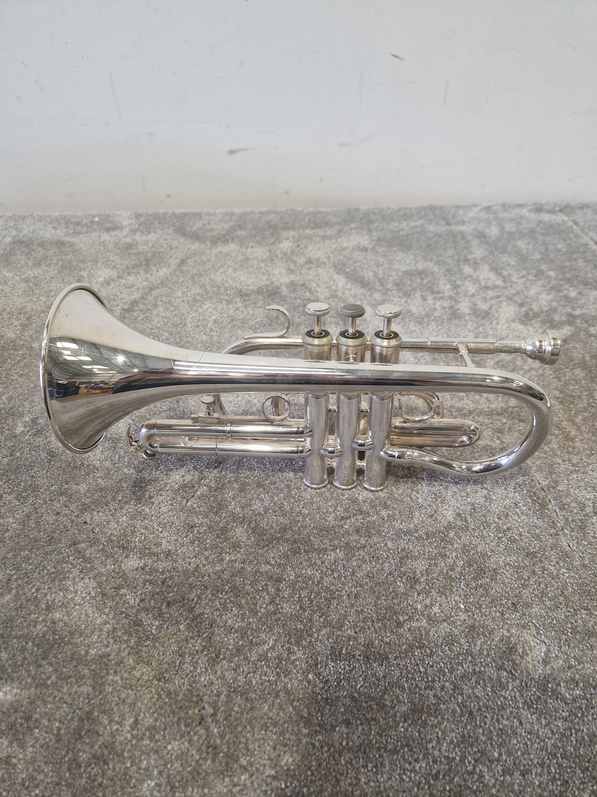 The Besson Be1020 Silver Plate is in overall good condition, with normal signs of use that do not affect its functionality or performance. There are minor scratches on the body, which are common for an instrument of this age and usage. Additionally, there are a few dings that can be seen upon close inspection, but they do not compromise the structural integrity of the cornet. General marks are present, reflecting its history of being played and enjoyed by its previous owner. Despite these cosmetic imperfections, the instrument remains in good working order and is ready to be played.