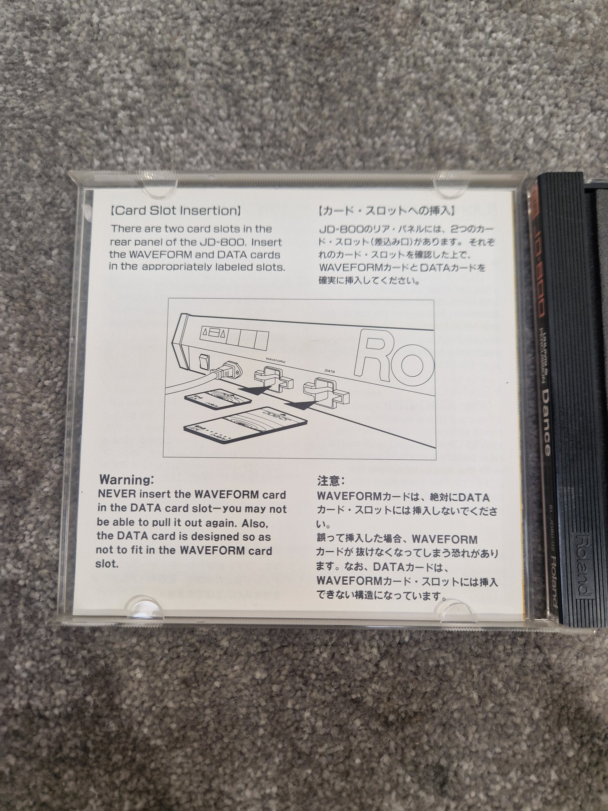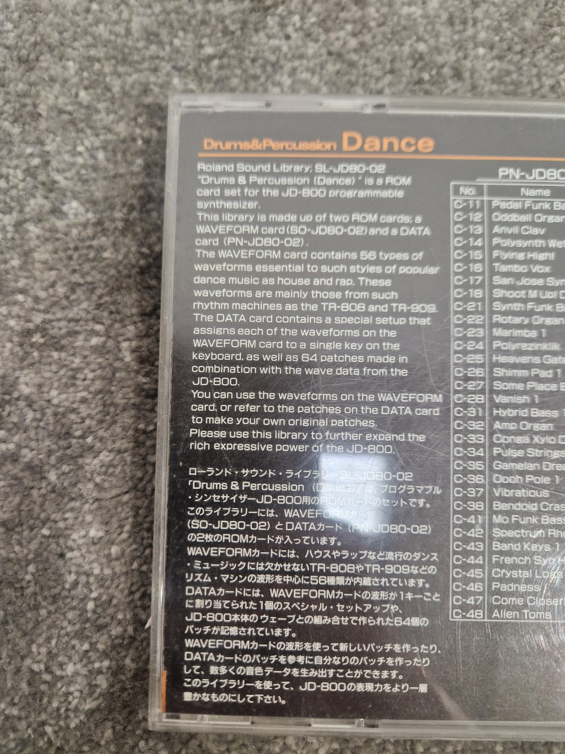 This purchase includes the Roland Drums and Percussion dance ROM card SL-JD80-02 and its original case. The original case provides excellent protection during storage and transportation, ensuring the card remains safe from potential damage. The case is designed specifically for this model, fitting snugly to prevent any movement that could cause wear.